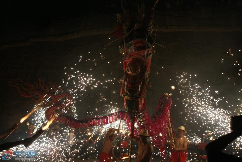 中敖火龍的顯著特色在于一個(gè)“火”字。舞龍從大年初一開(kāi)始,給千家萬(wàn)戶拜年,到元宵夜燒龍。燒龍時(shí),舞龍者先要沐浴,然后赤膊上陣,任由煙火噴、鐵水制成的禮花燒,直至整條龍?jiān)诒夼诼曋谢癁榛覡a,而舞龍者不受一點(diǎn)灼傷。