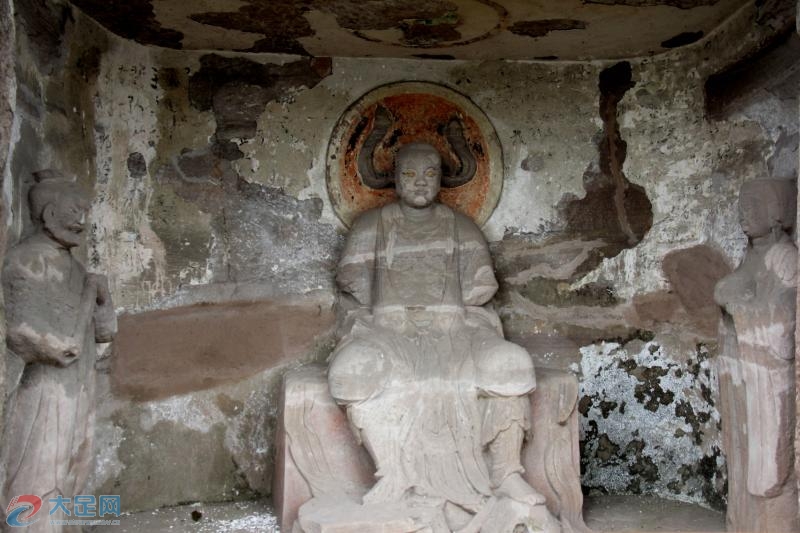 南山,古名廣華山、鏵刃山,位于大足龍崗鎮(zhèn)南2公里,海拔514米,與北山遙相對(duì)映。山頂有廟,名玉皇觀,修篁夾道,古木森森。歷代文人墨客多于此品茗賦詩。造像開鑿于公元1131-1162年(南宋紹興年間)。崖面長(zhǎng)86米,高3.5-10.2米,通編為15號(hào)。其中造像5龕窟,主要有三清古洞、后土圣母龕、龍洞、真武大帝龕等道教題材。在大足石刻中,公元11-13世紀(jì)的道教石刻,是中國(guó)道教石窟造像最多、最集中、反映神系(神仙系統(tǒng))最完整的。保存完好者有5處,以南山為著。如第5號(hào)三清古洞,共刻像421尊,以道教最高神“三清”為主,配刻以“四御”及圣母、王母等群神,生動(dòng)地反映了公元12世紀(jì)道教已由早期的老君、“三官”崇拜演變?yōu)樯裣怠⑸耠A明確的“三清”、“四御”信仰的歷史事實(shí)。在中國(guó)宋代道教石窟中,此窟雕刻最為精美;就內(nèi)容而言,是最完備而有系統(tǒng)的反映宋代道教神第的實(shí)物資料,有著極高的宗教、歷史、藝術(shù)價(jià)值。