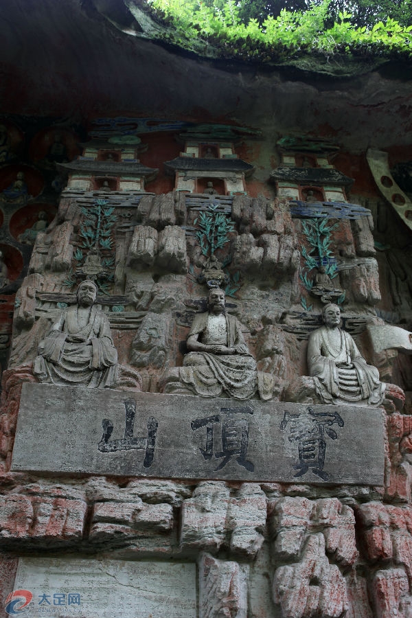 寶頂山石刻位于大足區(qū)龍崗街道辦事處東北15公里處的寶頂鎮(zhèn),海拔527.83米,占地約400畝。寶頂山石刻包括以圣壽寺為中心的大佛灣、小佛灣造像,由號稱“第六代祖師傳密印”的趙智鳳于公元1174-1252年間(南宋淳熙至爐子佑年間),歷時70余年,有總體構(gòu)思組織開鑿而成,是一座造像近萬尊的大型佛教密宗道場。同時,也是大足石刻精華之所在,并把中國石窟藝術(shù)推上了最高峰。