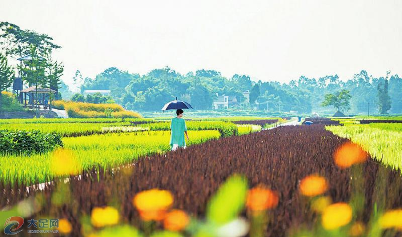 9月4日,大足區(qū)拾萬(wàn)鎮(zhèn)長(zhǎng)虹村,游客徜徉在“五彩稻田”中。