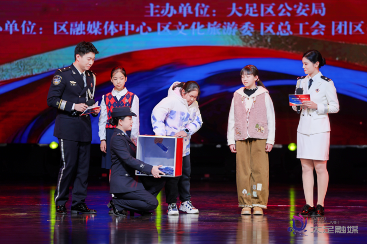 隨著激昂的旋律響起,文藝匯演正式拉開帷幕。匯演以四個(gè)篇章層層遞進(jìn)、漸入高潮,全方位展現(xiàn)公安工作與隊(duì)伍風(fēng)采。第一篇章《薪火相傳》通過歌曲、小品等節(jié)目,詮釋了公安隊(duì)伍初心不改、使命傳承的信仰力量。第二篇章《智警強(qiáng)基》聚焦公安工作現(xiàn)代化,以宣傳片與主題節(jié)目相結(jié)合的形式,全面展現(xiàn)了科技強(qiáng)警的“大足實(shí)踐”。第三篇章《寄語(yǔ)》將活動(dòng)推向高潮,現(xiàn)場(chǎng)隆重表彰了社區(qū)警務(wù)、窗口服務(wù)、規(guī)范執(zhí)法等領(lǐng)域的崗位標(biāo)兵和優(yōu)秀團(tuán)隊(duì),同步以詩(shī)朗誦形式表達(dá)對(duì)實(shí)干者的敬意與支持。第四篇章《與家同行》深情聚焦民警家庭,生動(dòng)演繹出警屬的理解與奉獻(xiàn),傳遞警民一心、魚水情深的深厚情誼。