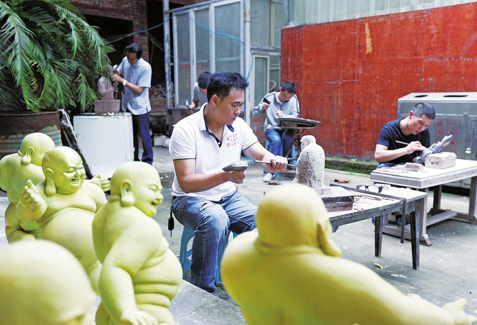 昨日,在劉能風(fēng)技能專家工作室,石雕藝人正在專注地雕刻。受世界文化遺產(chǎn)大足石刻藝術(shù)魅力感染,我區(qū)石雕民間藝人逐年增多,其從業(yè)人員達到2萬余人,石雕產(chǎn)品更是因其工藝精、藝術(shù)價值高而暢銷國內(nèi)外40多個國家和地區(qū)?! ∮浾唿S舒攝