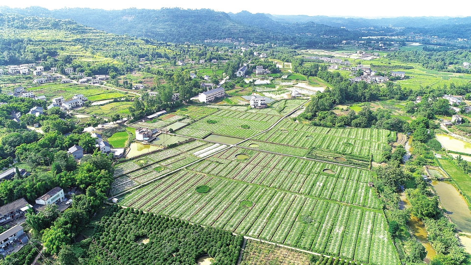 近日,航拍下的寶頂鎮(zhèn)倒廟村一片生機勃勃。據(jù)悉,我區(qū)依托“企業(yè)+基地+農(nóng)戶”模式,建成優(yōu)質(zhì)糧油基地35萬畝、特色果蔬基地45萬畝、芳香產(chǎn)業(yè)1萬畝,糧經(jīng)比優(yōu)化至50.7:49.3。記者 黃舒 攝