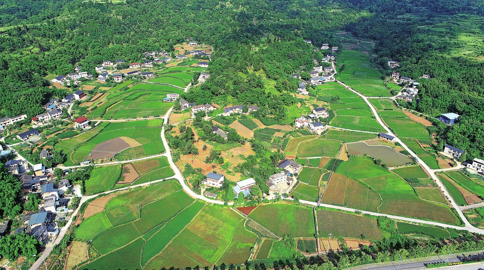 近日,無(wú)人機(jī)拍攝的寶頂鎮(zhèn)田園美如畫(huà)卷。初夏時(shí)節(jié),雨水充沛,全區(qū)45萬(wàn)畝水稻長(zhǎng)勢(shì)良好,稻田里一片綠意盎然,與村莊構(gòu)成一幅幅秀美的田園風(fēng)光圖。 記者黃舒攝